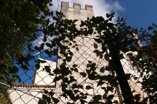 An der Grünwalder Brücke halten die Flöße für eine Rast; im Hintergrund die Grünwalder Burg. -