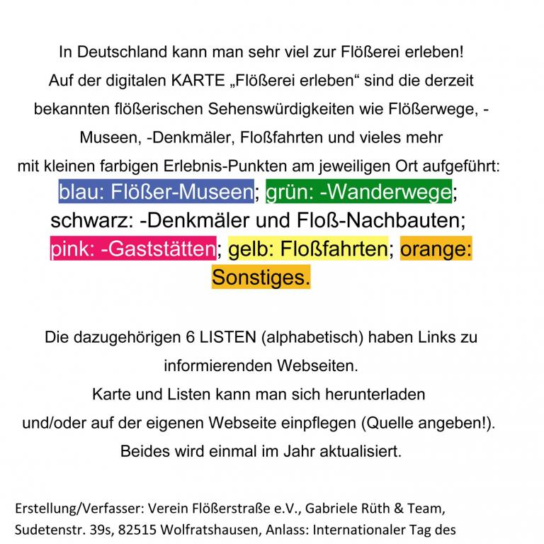Online einsehbar: Pünktlich zum UNESCO-Thementag war das Projekt fertig. Spreng informierte daraufhin Nina Dederichs von der Deutschen UNESCO-Kommission, die unserem Verein ein großes Kompliment aussprach! Das Ergebnis ist auf unserer Seite unter ??? Tipps??? oder der DFV-Homepage abrufbar unter: https://www.floesserei-vereinigung.de/floesserei-erleben. Dort finden sich eine Deutschlandkarte mit unterschiedlich farbigen Erlebnispunkten sowie eine detaillierte Liste – kostenlos zum Download.