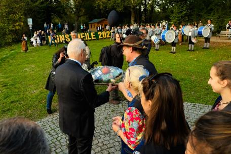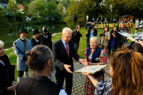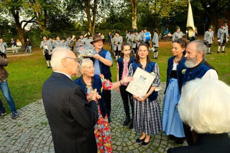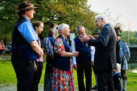 Seinen 80. Geburtstag feierte der ehemalige bayerische Ministerpräsident Dr. Edmund Stoiber in seinem Wohnort Wolfratshausen. Als Ehrenbürger der Stadt wurde er entsprechend groß an der Alten Floßlände gefeiert: Es gratulierten 1. Bürgermeister Klaus Heilinglechner, die Gebirgsschützen, bei denen er Ehrenmitglied ist, sowie auch wir von der Flößerstraße - doch nicht nur das: Weil sich Dr. Stoiber während der schlimmen Corona-Zeiten für die Betriebe der Flößerfamilien Franz Seitner und Sepp Seitner sowie Michael Angermeier mehrfach eingesetzt hatte – 2020 und 2021 konnten keine Flöße fahren – war die Geburtstagsfeier die beste Gelegenheit, ihm als Dank zum „VIP“-Vereinsmitglied zu ernennen. Auch Geburtstagsgeschenke hatten wir mitgebracht, die kunstvoll (von „Bavaria Selection“) auf einem großen Holzfloß drapiert waren.