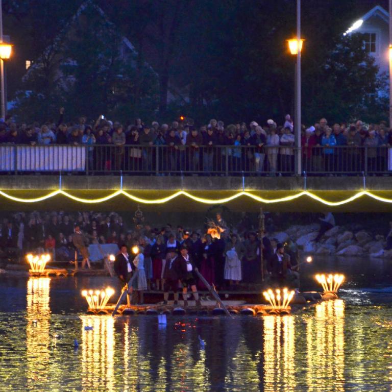 Ab Einbruch der Dunkelheit feierte die Stadt Wolfratshausen diese auf der Welt einmalige Flößertradition gemeinsam den ortsansässigen Flößereibetrieben, den Kirchen und den ortsansässigen Traditionsvereinen.Die Floßprozessionen wurden bis 1910 in Wolfratshausen regelmäßig durchgeführt. Wieder mit dabei unser Vizevorsitzender Hermann Paetzmann (3.v.links), der diesmal die Fackel hält.
