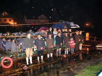 Als die beiden Flöße, eines mit der hell angestrahlten Nepomukstatue, den Flößern, ihren Familien und Freunden (darunter auch unser Vize Hermann Paetzmann), das andere mit den Ehrengästen, an der Spitze Bürgermeister Helmut Forster, an der Alten Floßlände ankamen, wurden sie erwartet von den Abordnungen der örtlichen Vereine d"Loisachtaler und der Königlich Privilegierten Feuerschützengesellschaft. Der Spielmannszug der Gebirgsschützen spielte auf und die Böllerschützen, ließen es so laut krachen, dass es kräftig vom Bergwald wiederhallte. Fackeln auf der Loisach, zahllose Lichter an den Brücken und Fackelträger an Land, beleuchteten das Geschehen.