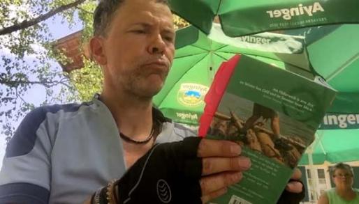 Diesmal wurde sogar eine kurze Strecke abgeradelt, der BR-Filmer Frank Jordan schwang sich von Mittenwald bis Bad Tölz auf sein Radl. Immer mit dabei: Unser Buch, das er wie man sieht, fleißig studierte. Bitte beachten: die roten Einmerkerl von unserer Vorsitzenden Gabriele Rüth, die ihn damit auf besonders sehenswerte Plätzen hinweisen wollte.