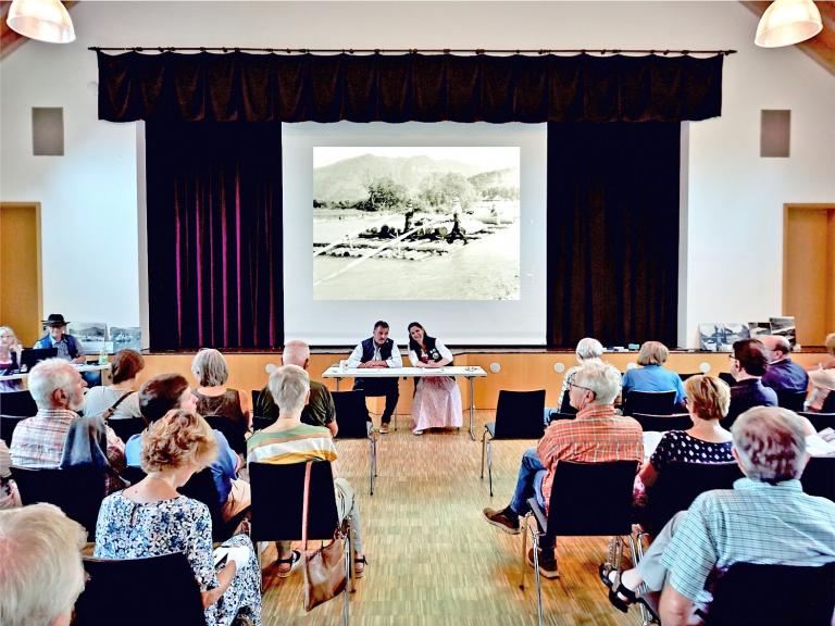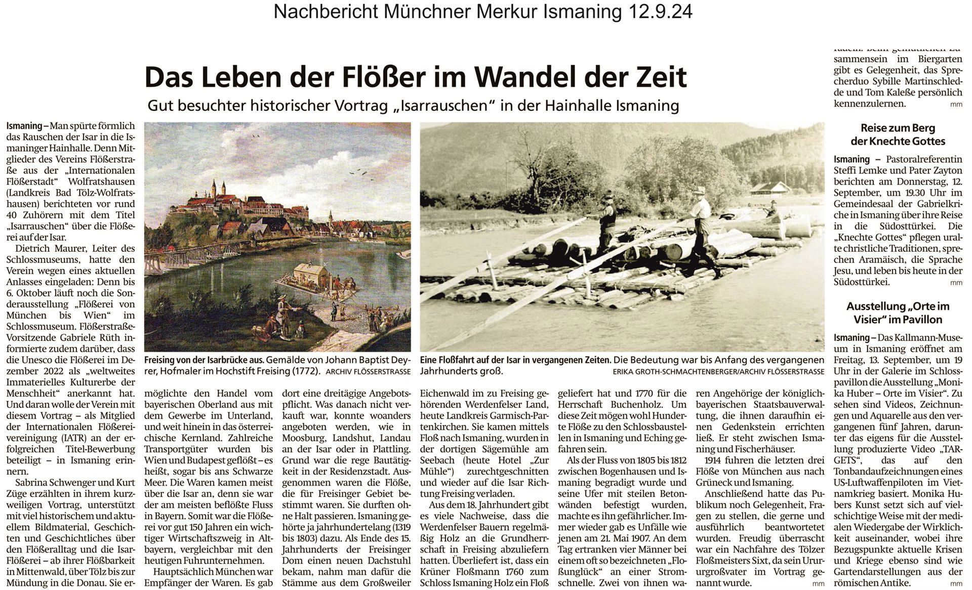 Unsere Mitglieder Sabrina Schwenger und Kurt Züge lasen in der städtischen Hainhalle in Ismaning auf Einladung vom städtischen Schlossmuseums-Leiter Dietrich Maurer. Die beiden sorgten mit ihrem Vortrag, den unsere Vorsitzende Gabriele Rüth aus historischen Quellen verfasst und mit reichlich Bildmaterial bestückt hatte, für Staunen, aber auch so manches Schmunzeln. Speziell zu Ismaning berichteten sie unter anderem, dass um 1770 wohl Hunderte Flöße zu den Schlossbaustellen in Ismaning und Eching gefahren sind, speziell ein Floßmann aus Krün im Werdenfelser Land hat 1760 für das Schloss Ismaning Holz geliefert. 1914 fuhren die letzten Flöße von München nach Grüneck und Ismaning. Anschließend konnten noch Fragen gestellt werden. Anlass war die Sonderausstellung „Flößerei von München bis Wien“ des mit uns befreundeten Flößer Kultur-Vereins München-Thalkirchen gewesen, die am 20. Juli 2024 – auch mit unserem Beisein - im Ismaninger Museum eröffnet wurde.